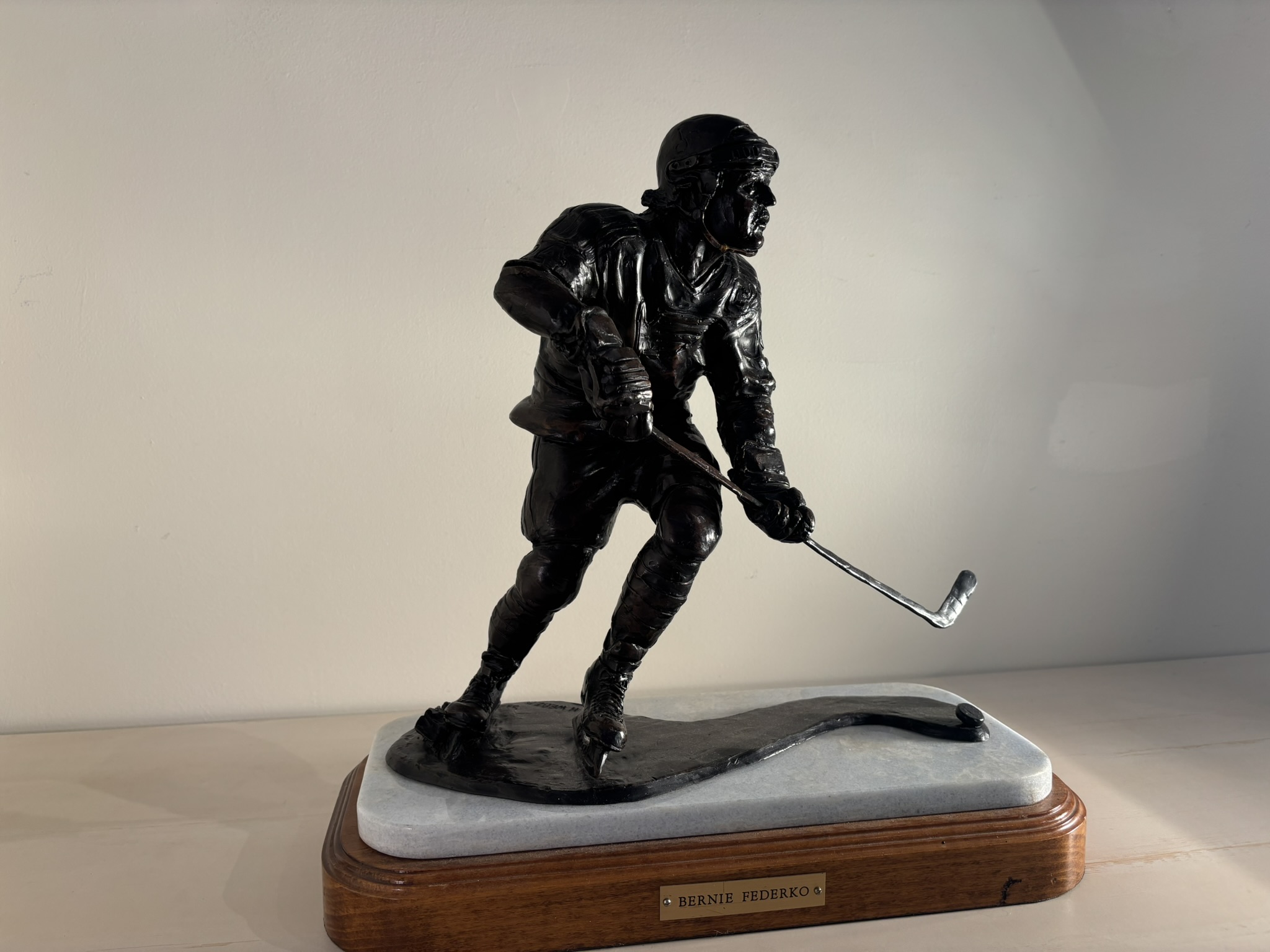 Bernie Federko Bronze 18″ x 15″ x 9″ This maquette served as the model for the larger than life sized statue of this famous St. Louis Blues player installed in 2003 outside of the Scottrade Center.