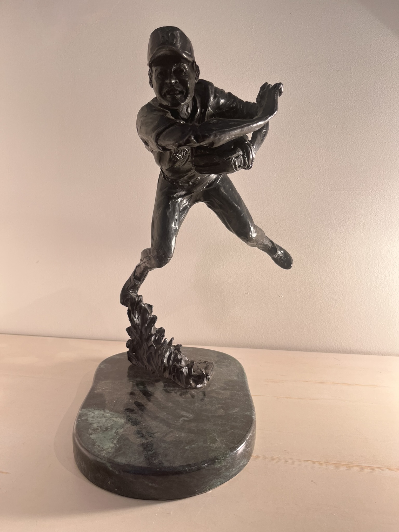 This maquette is the model for a larger than life sized statue of the famous KC Royals 2nd Baseman which was dedicated in 2004 at Kauffman Stadium in Kansas City.