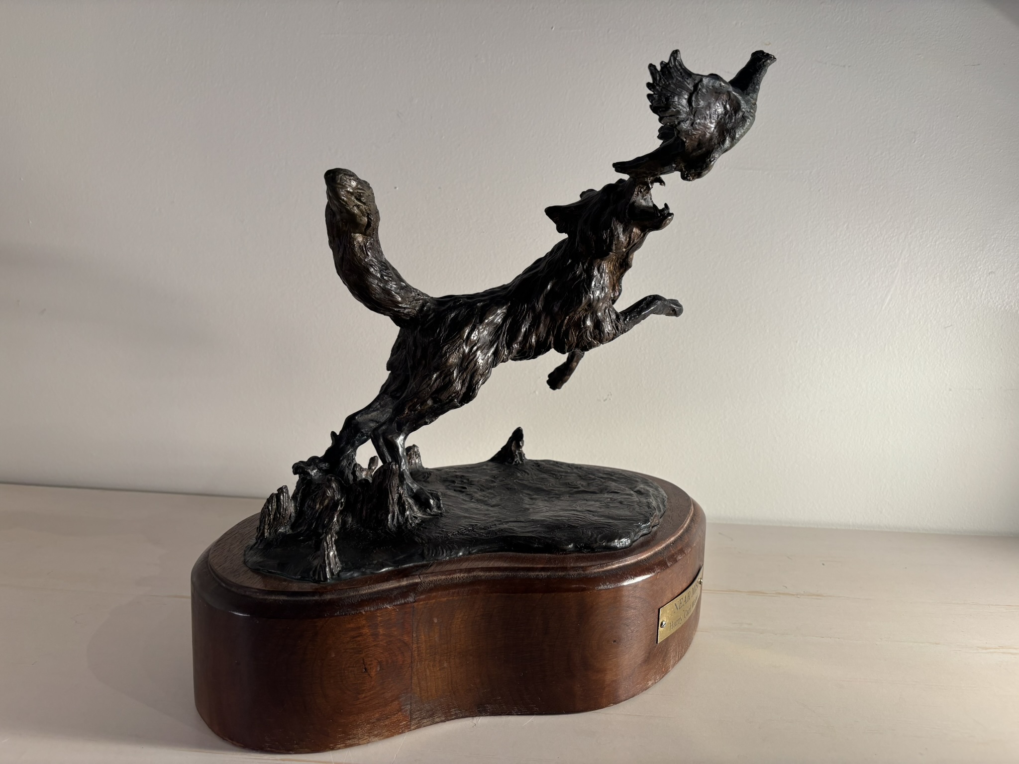 Near Miss Bronze 14″ x 12″ x 9″ This sculpture of a fox almost catching a grouse was inspired by a trip to Ireland in 1982. It is one of three cast.
