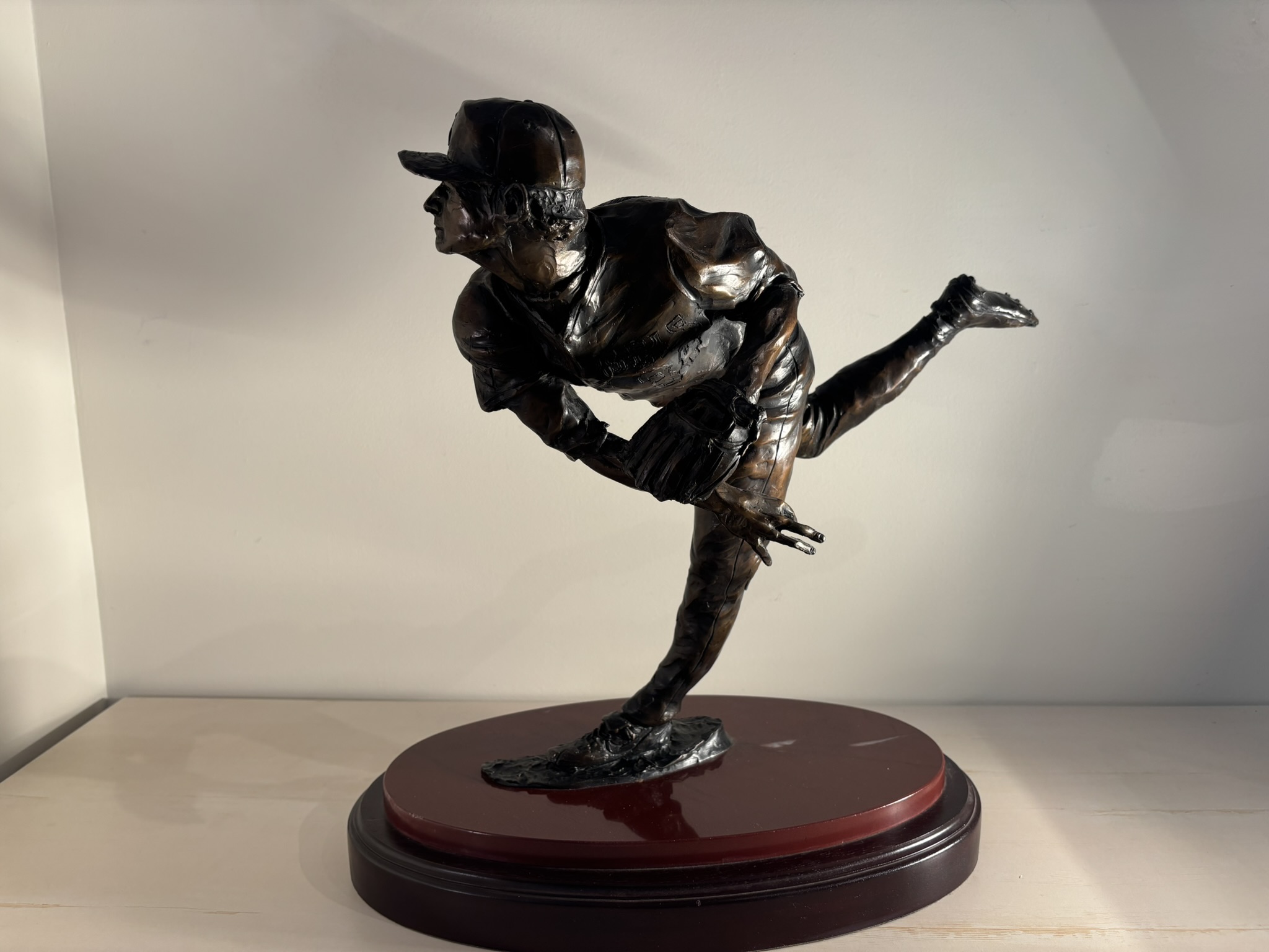 This statuette of Nick Adenhart was commissioned by the Anaheim Angels baseball team after the young pitcher was killed in a suspected drunk driving incident after pitching six scoreless innings during his Major League debut. It stands in the Angels clubhouse. An award is in Adenhart’s name is given to the Angel’s rookie pitcher of the year. There were three cast, this is the artist’s proof. 2011