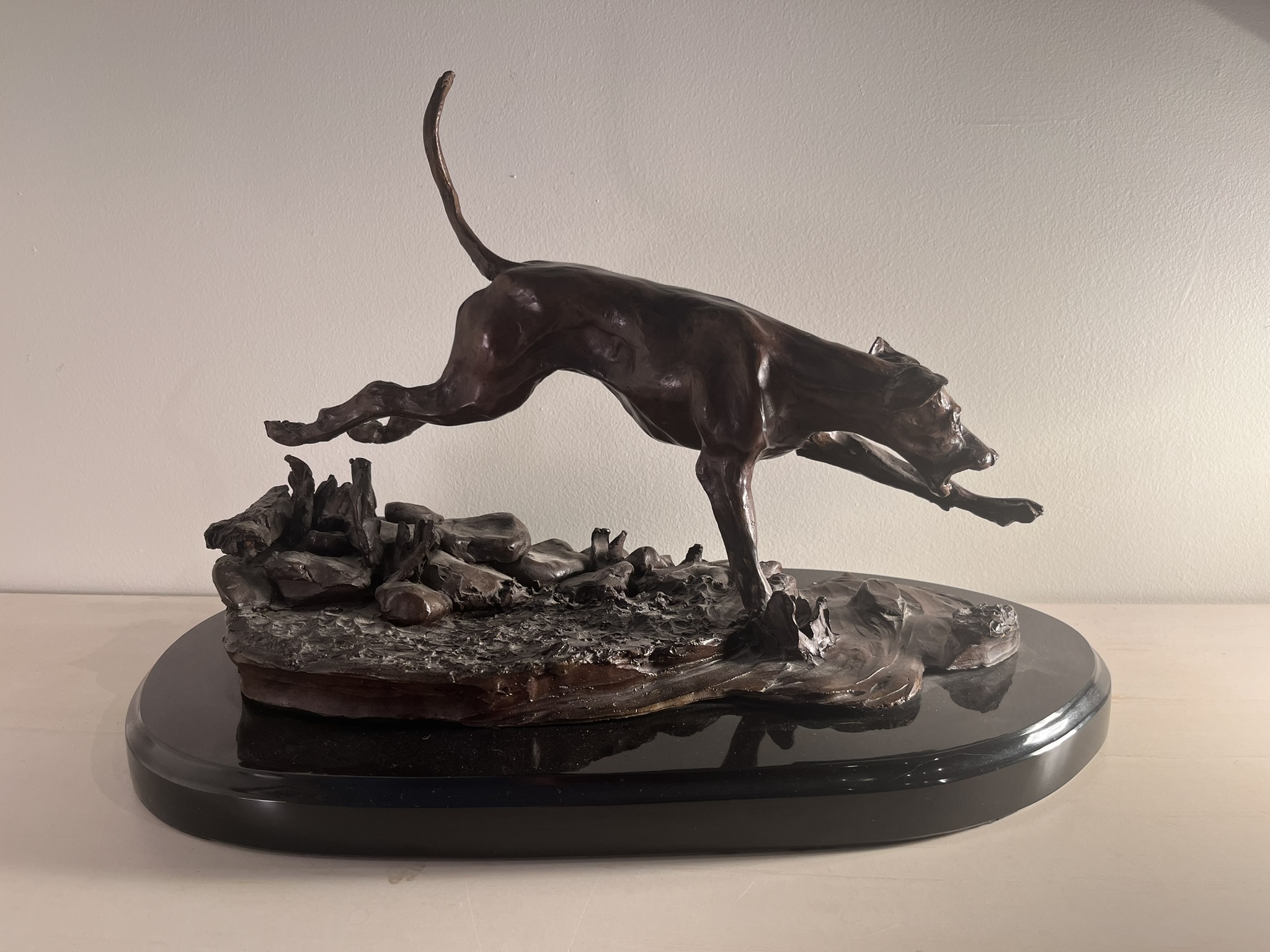 Running Foxhound Bronze 13″ x 18″ x 10″ This study of a foxhound on the line was inspired by hunting the hounds for the Bridlespur Hunt Club. It is one of six cast, this is the artist’s proof.
