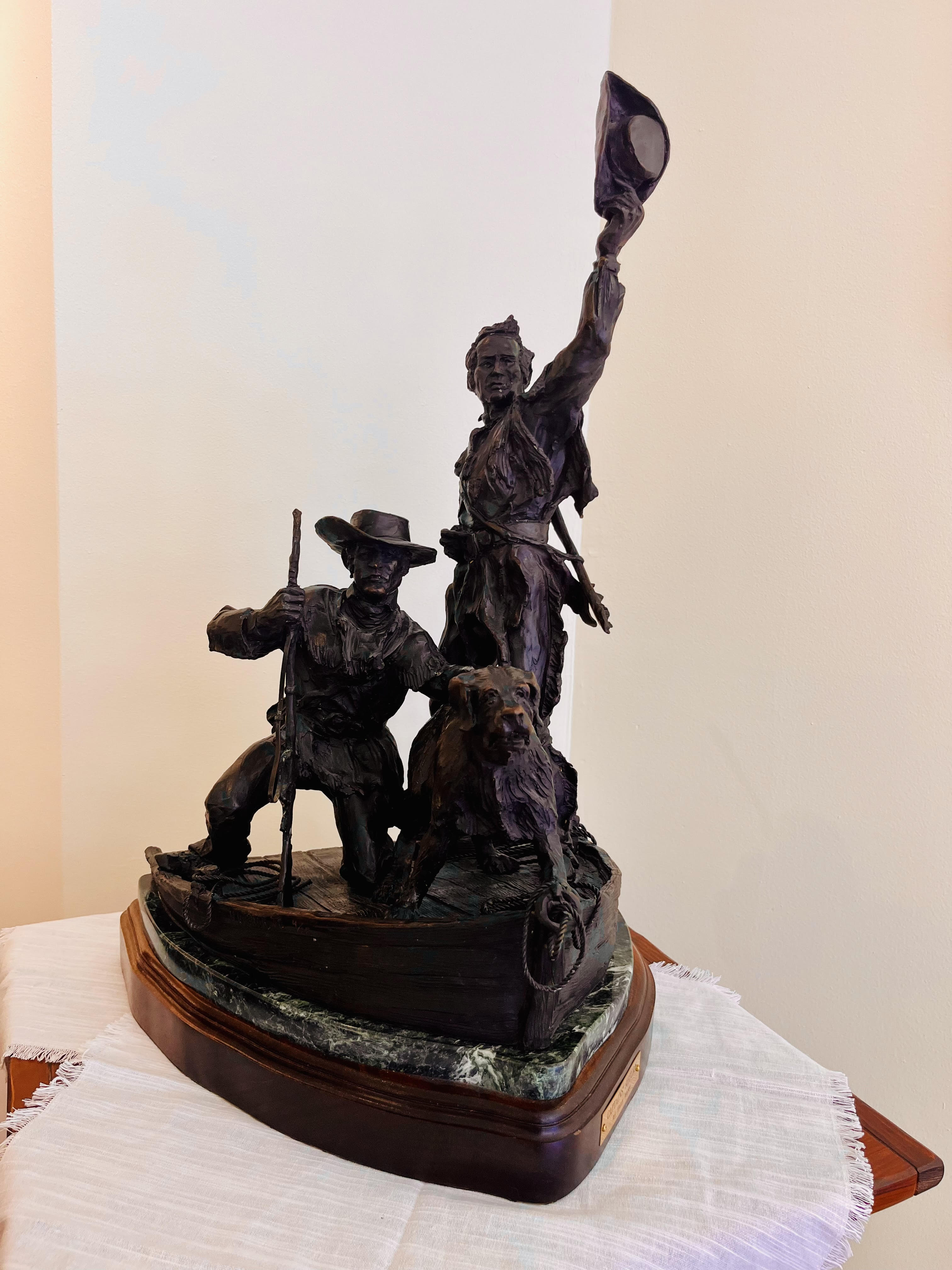 This maquette of The Captain’s Return captures in bronze the historical figures Meriwether Lewis and William Clark and their Newfoundland dog, Seaman. The three-and-a-half-ton sculpture was commissioned to commemorate the bicentennial of the explorers’ return September 23, 2006. Installed on the riverfront, this project involved negotiations with six governmental agencies and the construction of a base and statue capable of withstanding the inevitable floodwaters of the Mississippi River. Depending on how high the water is, sometimes the statue is submerged in the river, making it look as if Lewis and Clark are just sailing in. The Federal Parks Department designated the monument a national Lewis and Clark site.